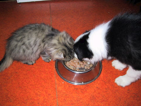 Chargin teilt ihr Essen "brüderlich" mit Katerchen Asterix aus unserer Norwegerzucht :-)